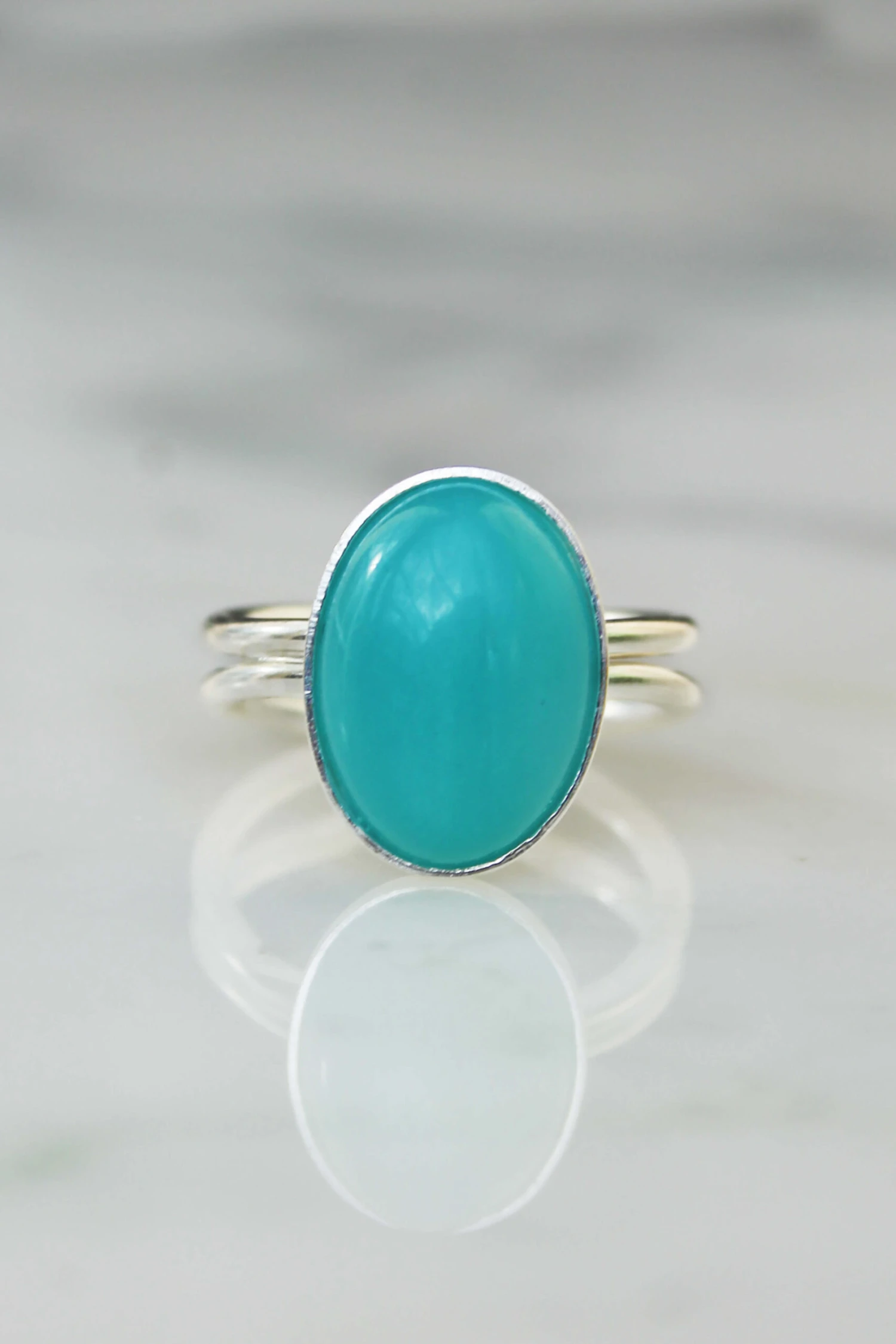 Un design fin et épuré, une touche de modernité, tout est fait dans la bague Marla pour mettre en valeur la pierre naturelle en cabochon. Associée ici à de l’Amazonite, une pierre d’une douce couleur bleu-vert, elle vient apporter une élégante touche de couleur à votre main.