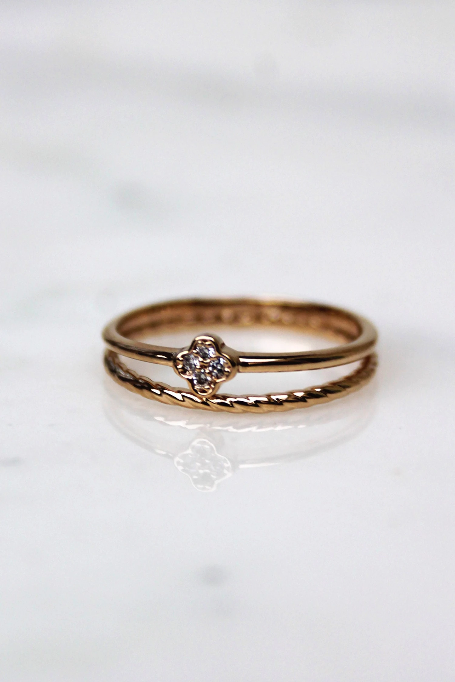 La bague Sofia, c’est un jeu de texture entre un or lisse et brillant, et l’anneau torsadé qui l’accompagne. Ornée d’un ravissant trèfle à quatre feuilles sur lesquels se trouvent des oxydes de zirconium, la bague Sofia fait partie de ces modèles fins et délicats que l’on conserve comme un vrai trésor…