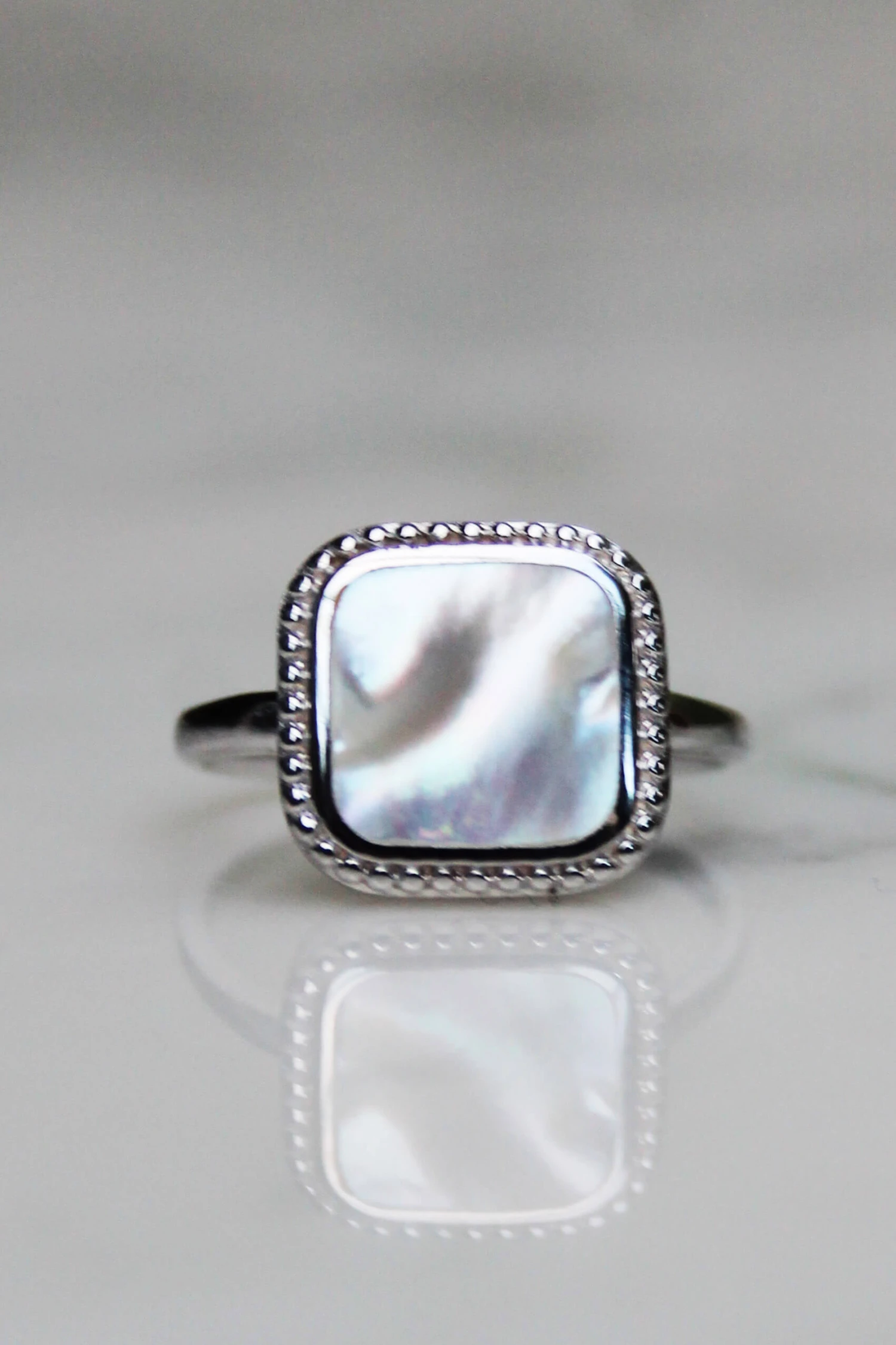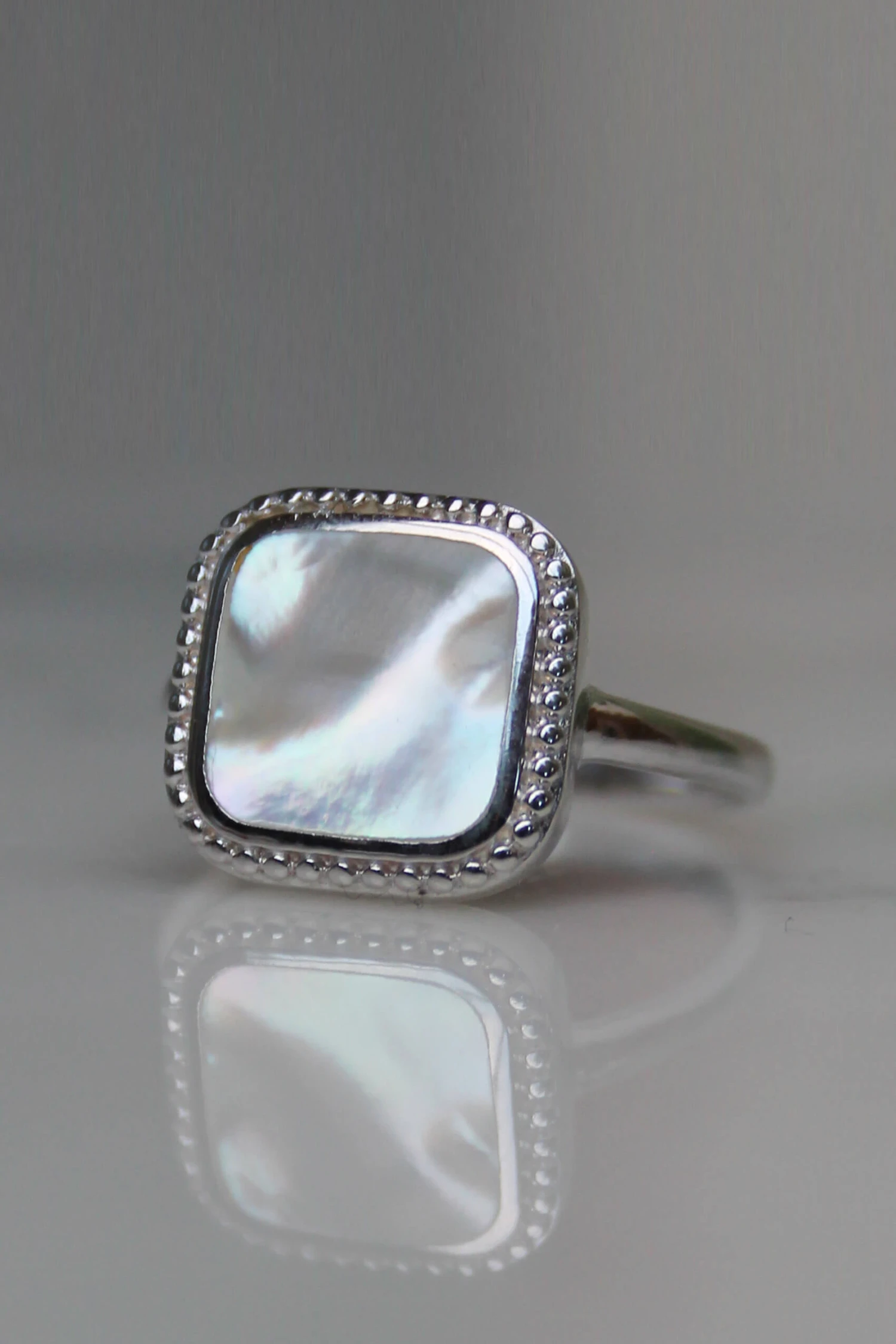 Le beau cabochon carré de nacre du modèle Thyia se décline en version bague, pour orner vos mains d’un véritable petit trésor !