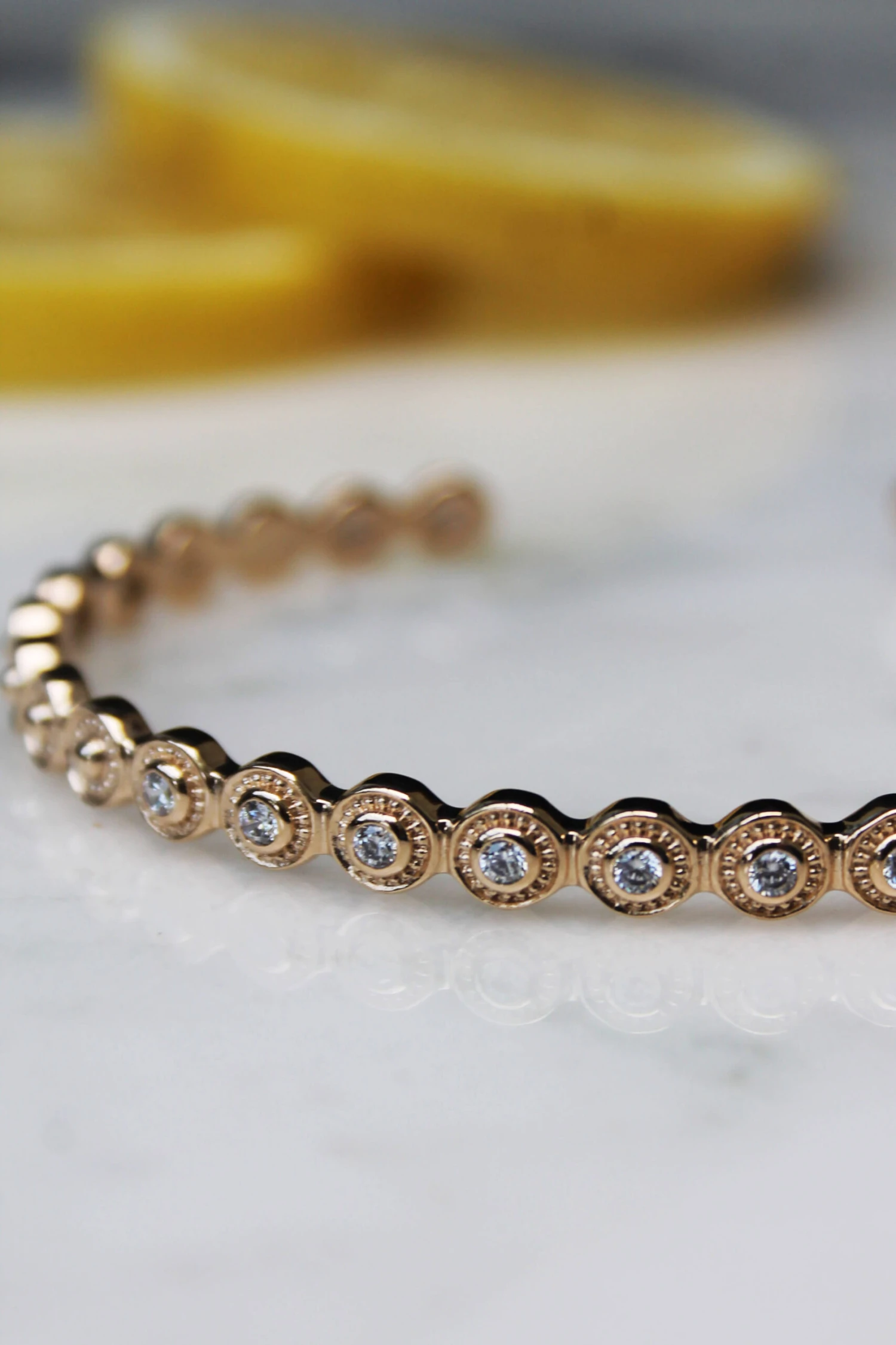 Douceur et rondeur sont les maîtres mots du jonc Antalya, dont la finesse de l’or est réhaussée de lumineux oxydes de zirconiums !