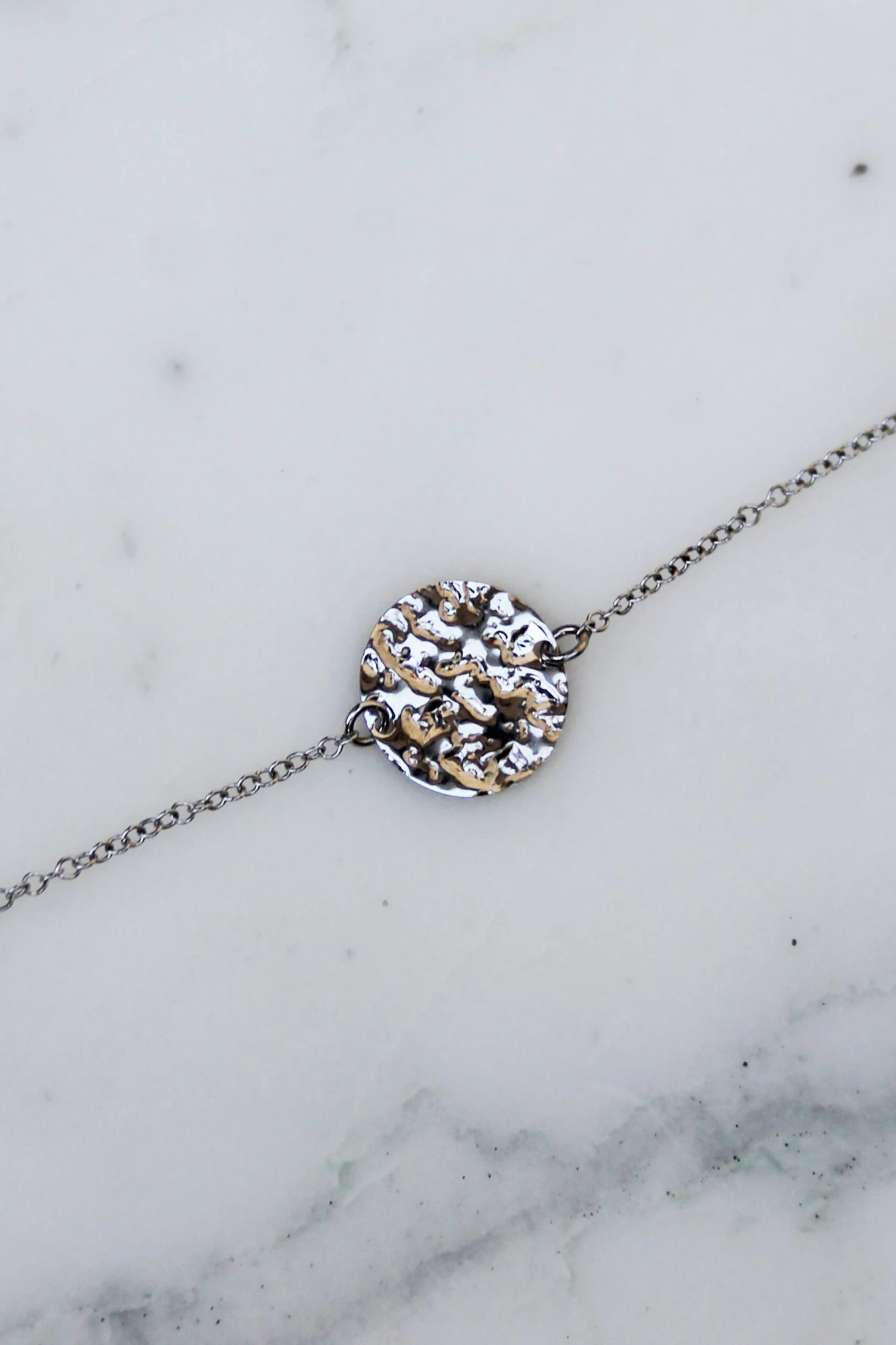 Habillez votre poignet de cet élégant bracelet orné d’un rond en argent martelé. Il saura ajouter une touche de féminité à toutes vos tenues !