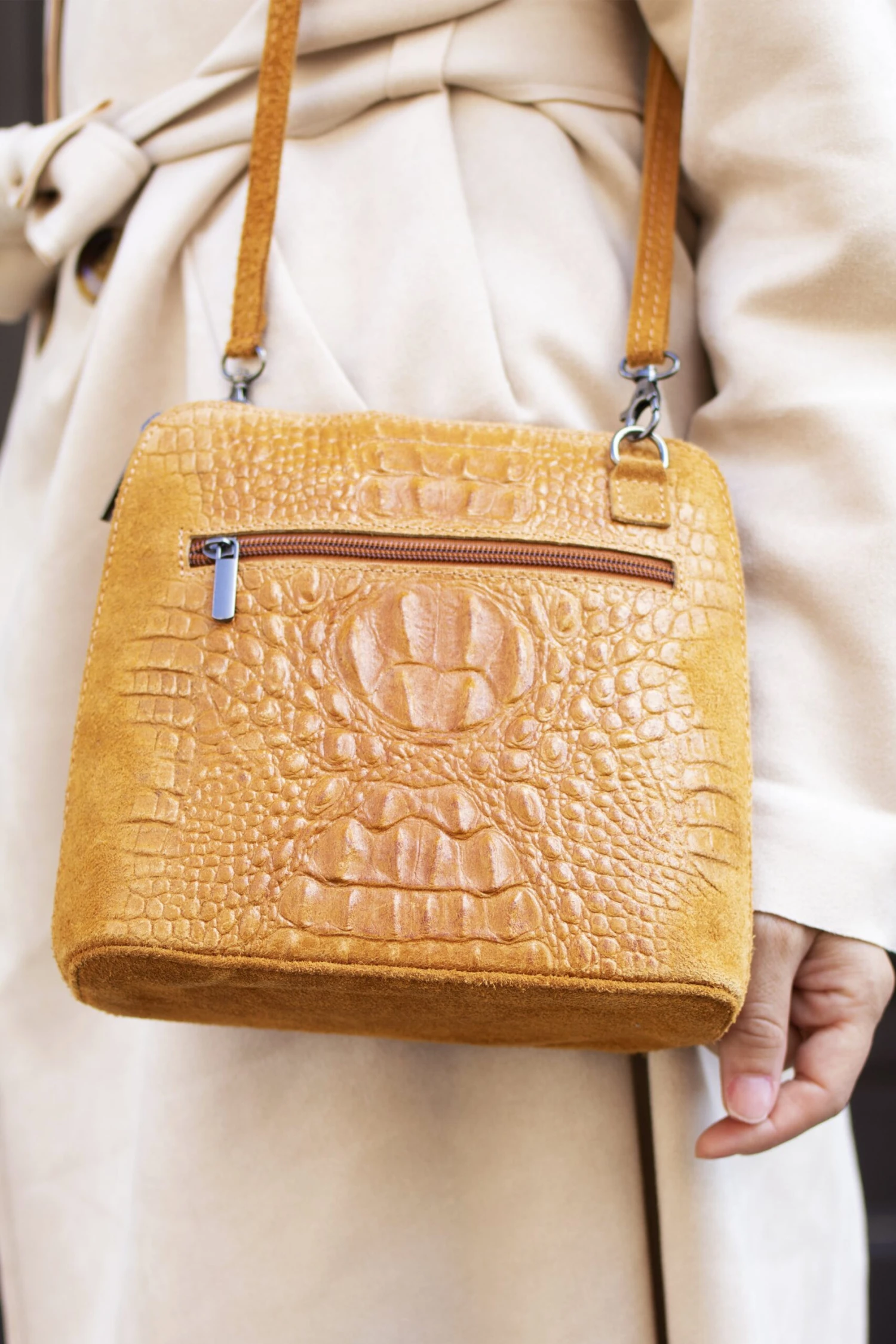 - Sac à main en cuir camel, entre le cuir lisse et la suédine selon les endroits du sac