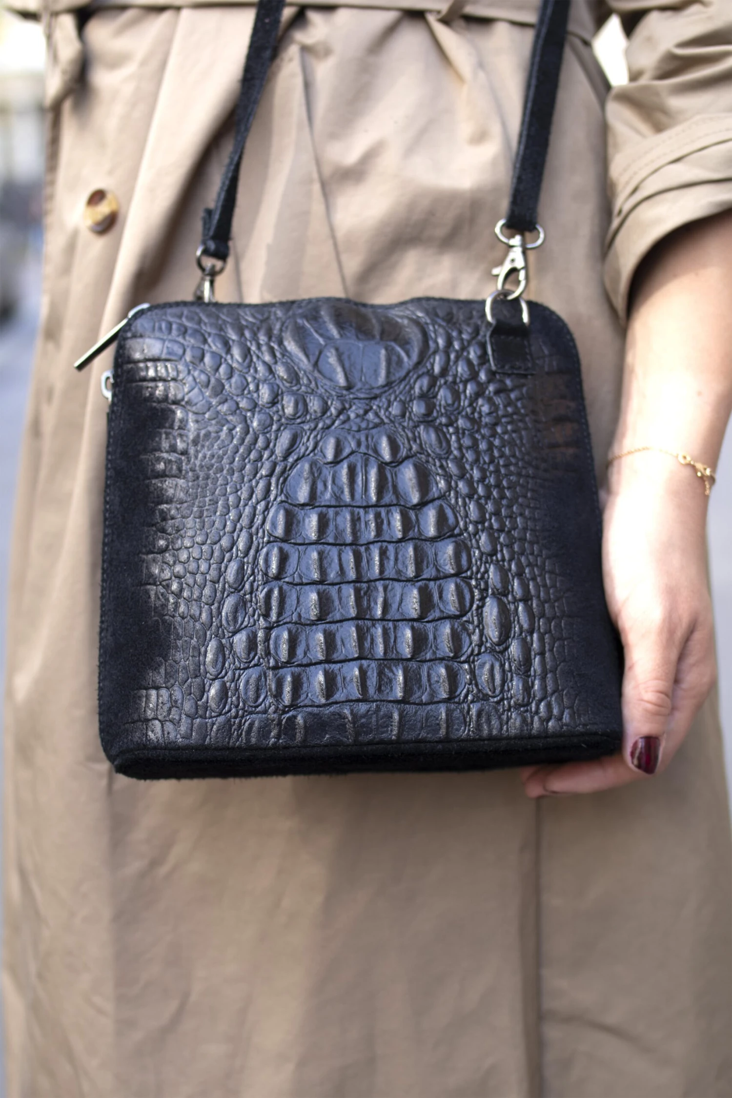 - Sac à main en cuir noir, entre le cuir lisse et la suédine selon les endroits du sac