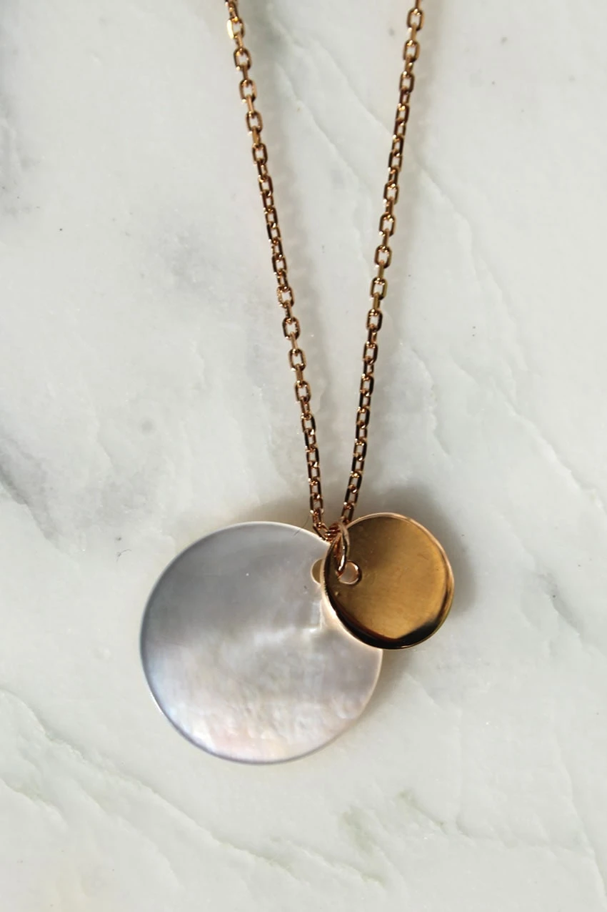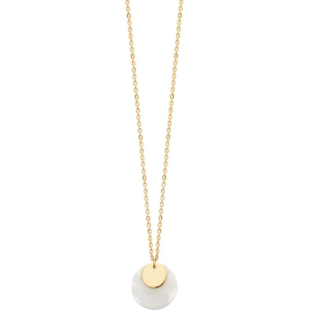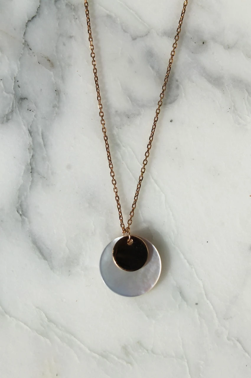 Sylla, c’est l’alliance de deux pampilles rondes, l’une dorée et l’autre en nacre, pour un collier plein de douceur et de délicatesse.