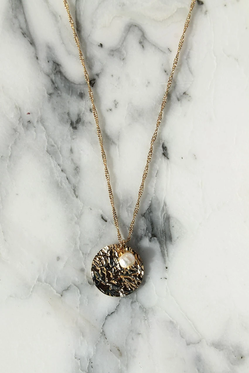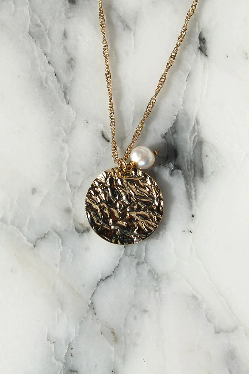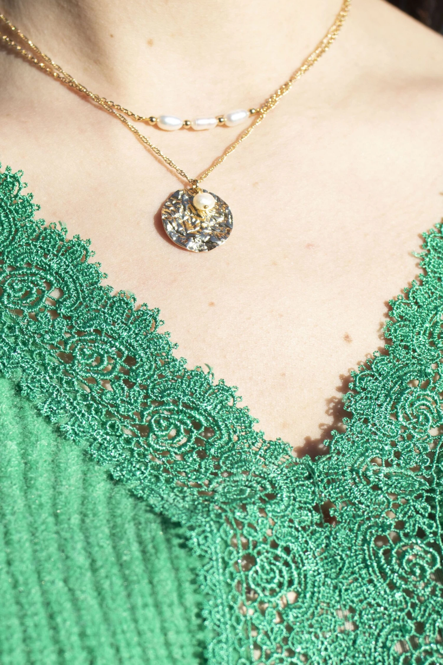 Le collier Timo se décline cette saison dans un nouveau format ! On craque toujours autant pour l’alliance de cette médaille dorée et texturée, avec cette délicate petite perle d’eau douce.