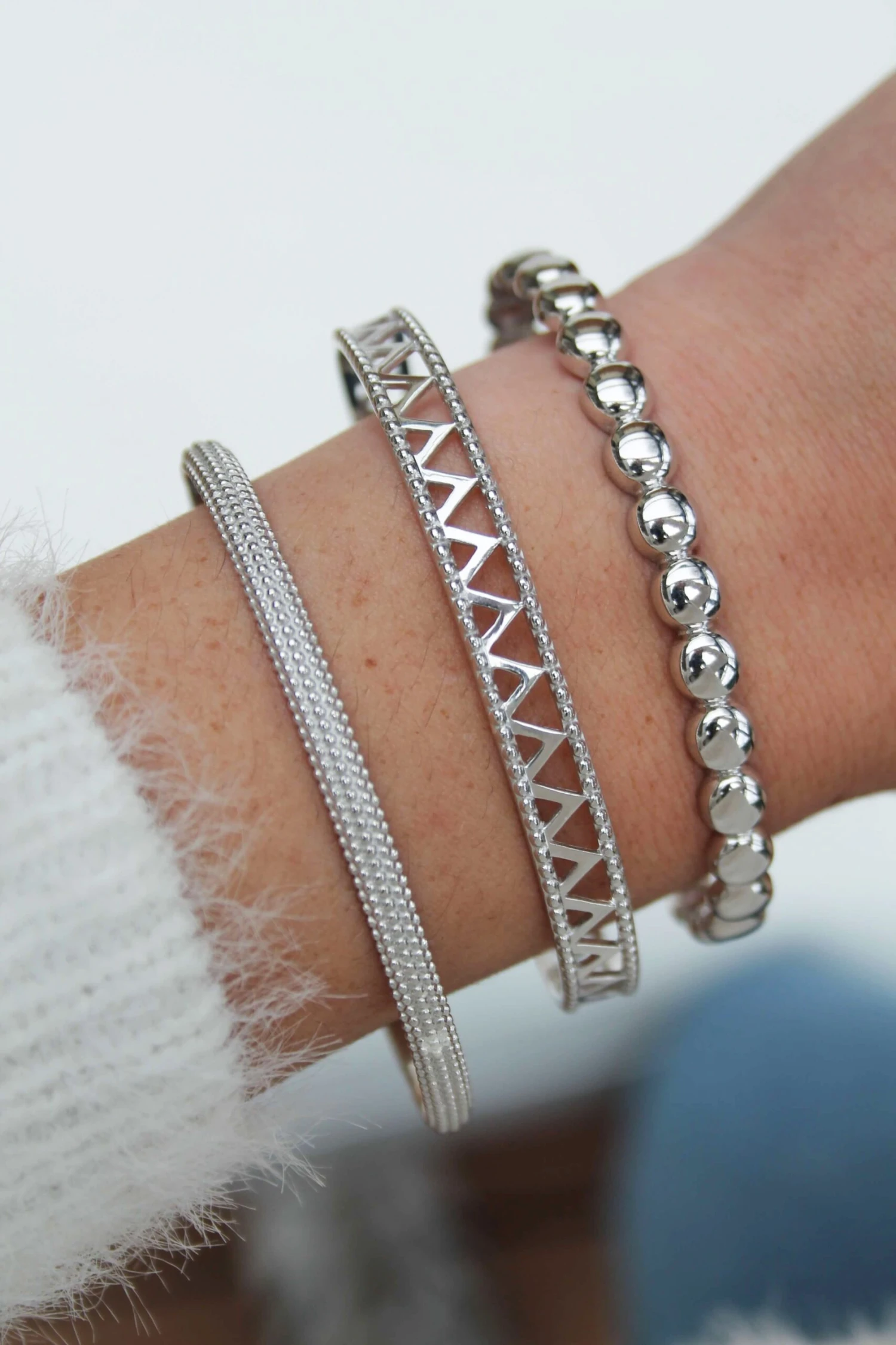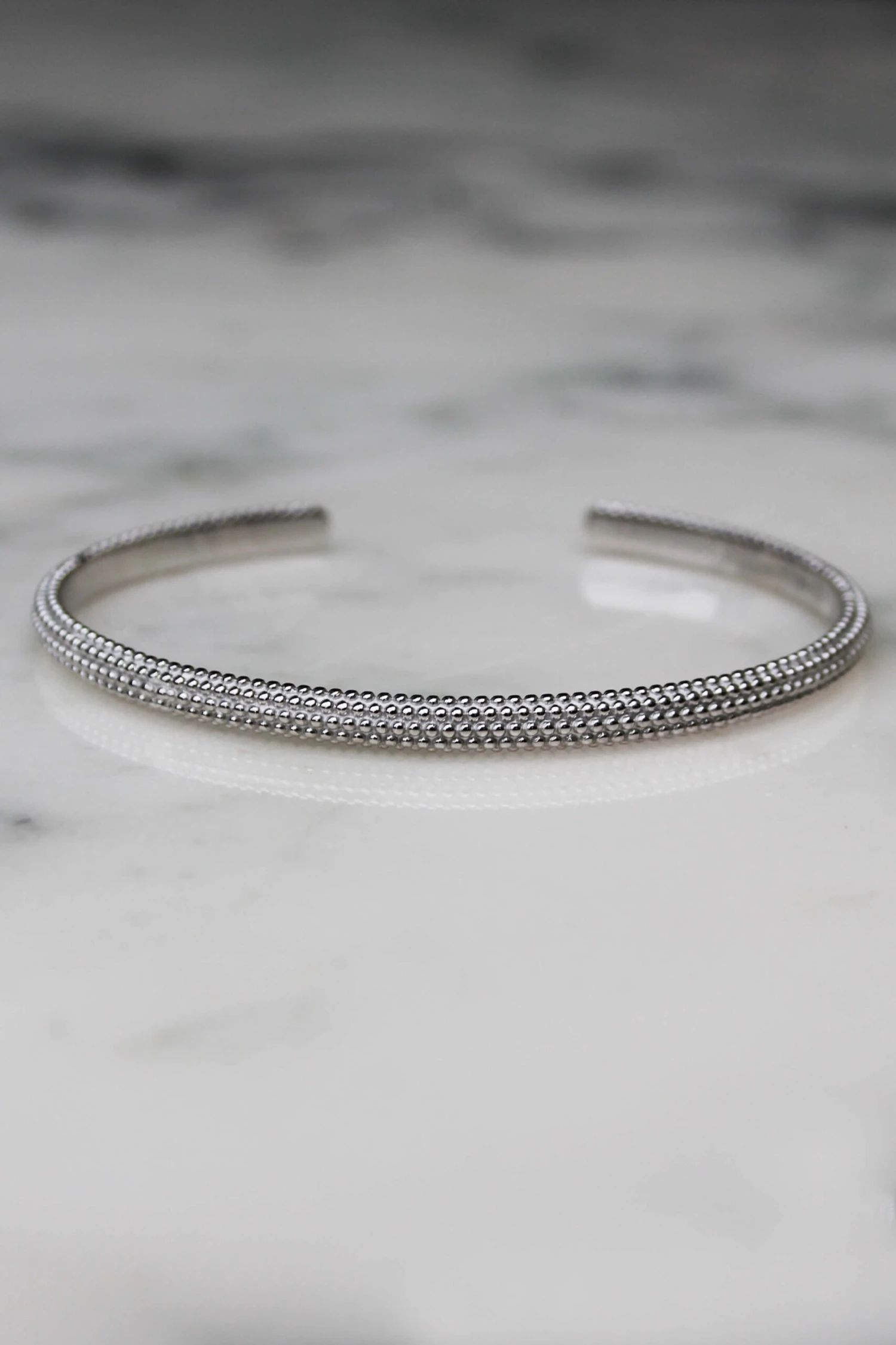 Le jonc Orion joue sur la texture et les matières avec finesse et élégance. L’argent est travaillé de manière à créer un effet « en pointillé », pour un rendu qui habillera délicatement votre poignet.