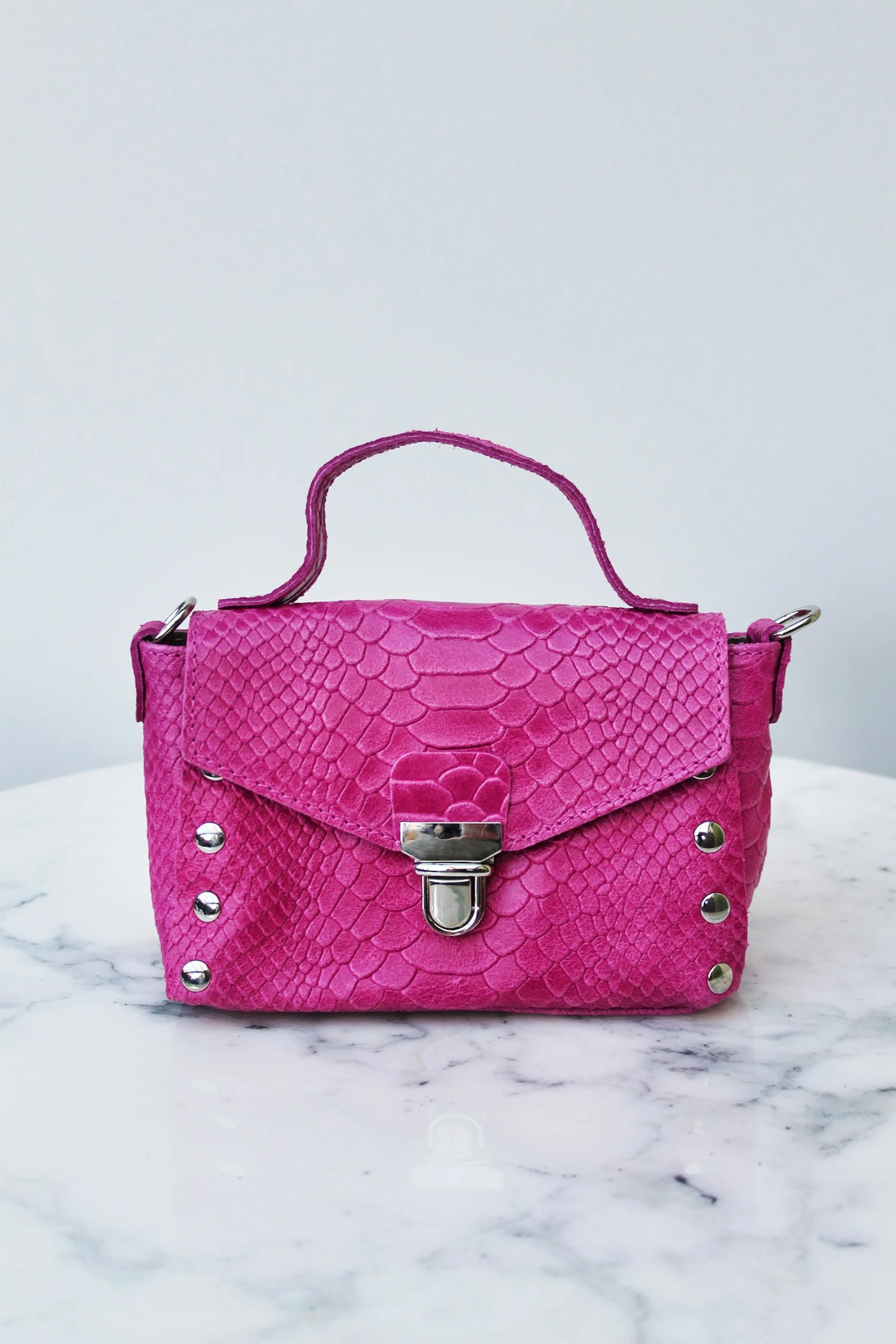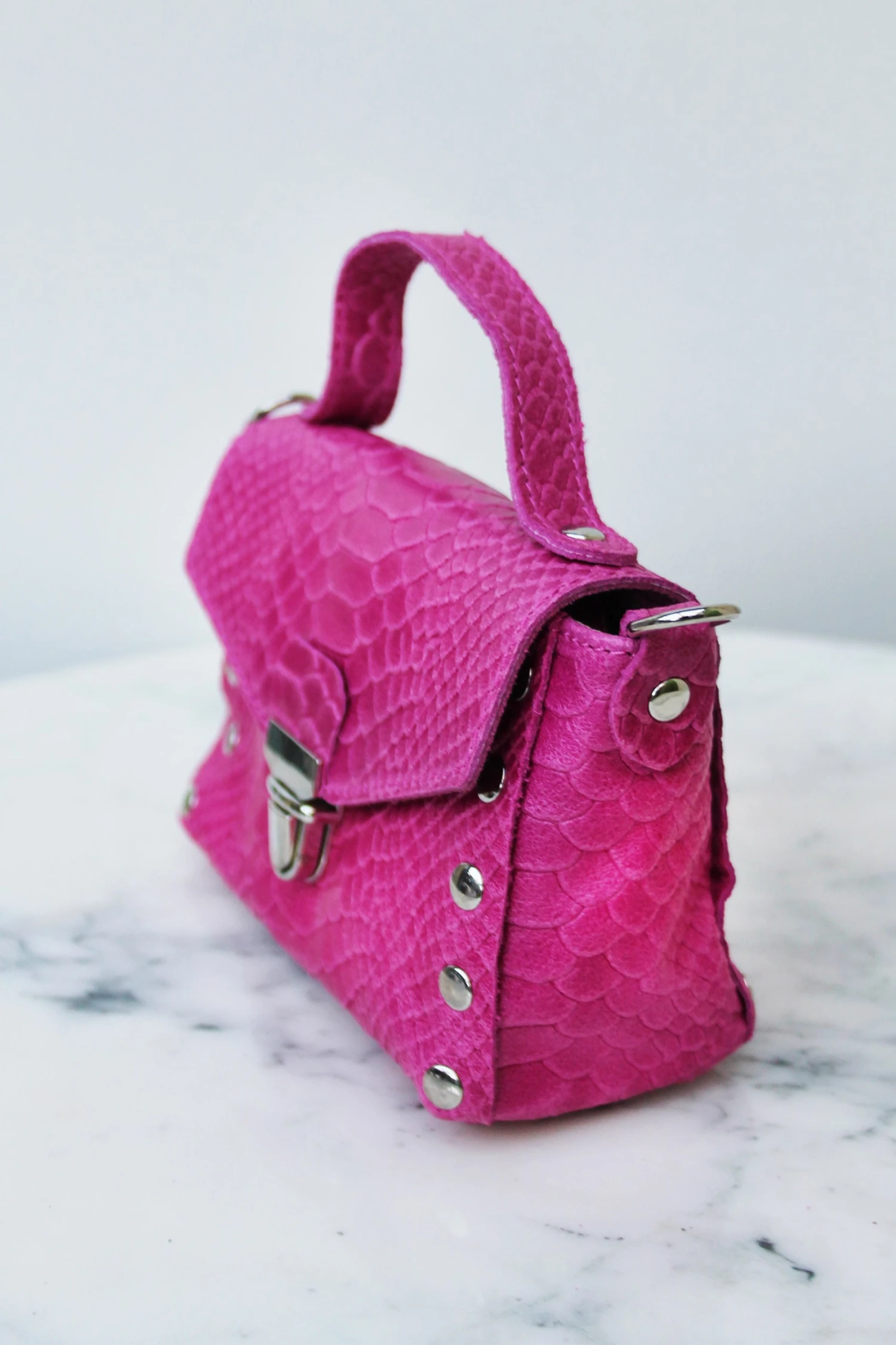 - Micro-sac à main en cuir rose fuschia travaillé façon python