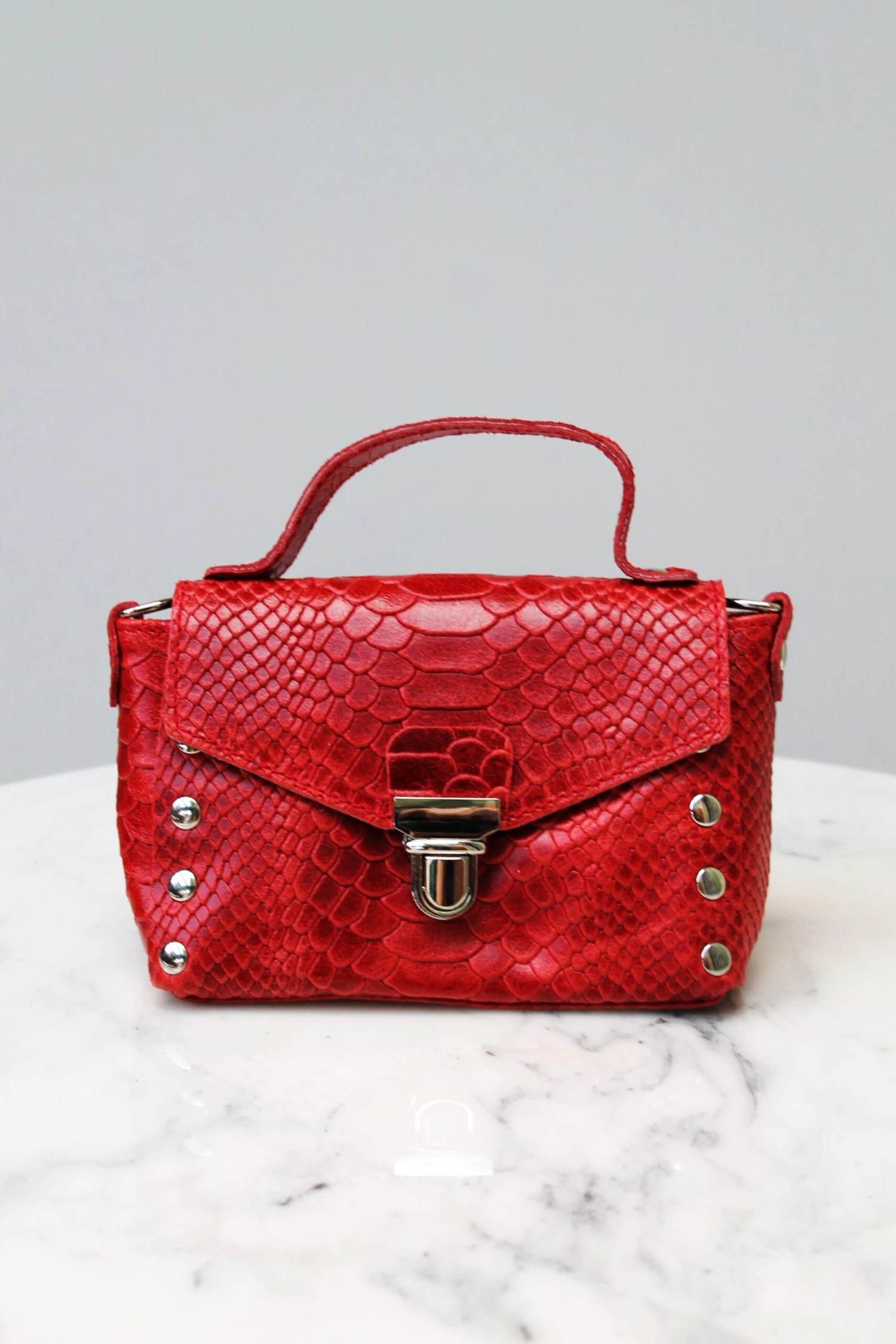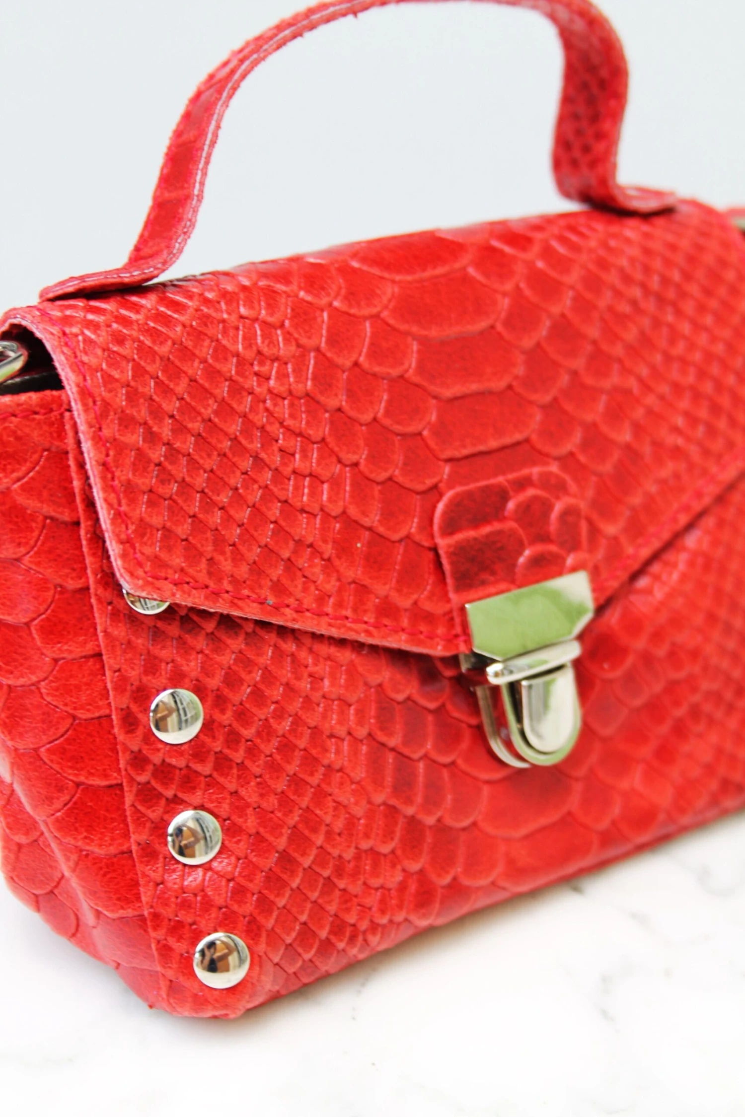 - Micro-sac à main en cuir rouge travaillé façon serpent